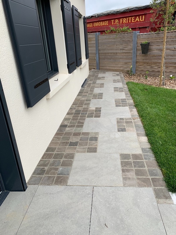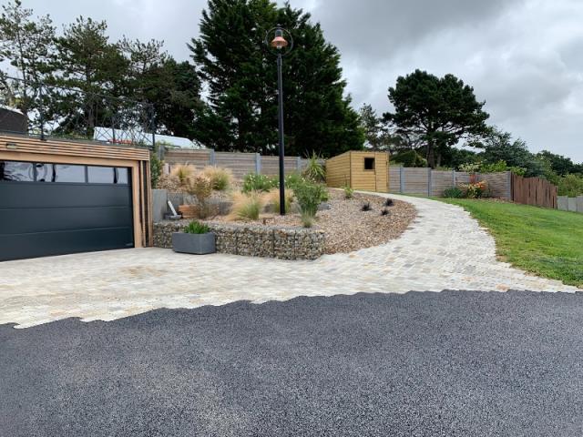 Guidé par notre équipe, le choix du client s'est porté sur une longue allée en pavé pierre grès, offrant une vue plongeante sur la mer.