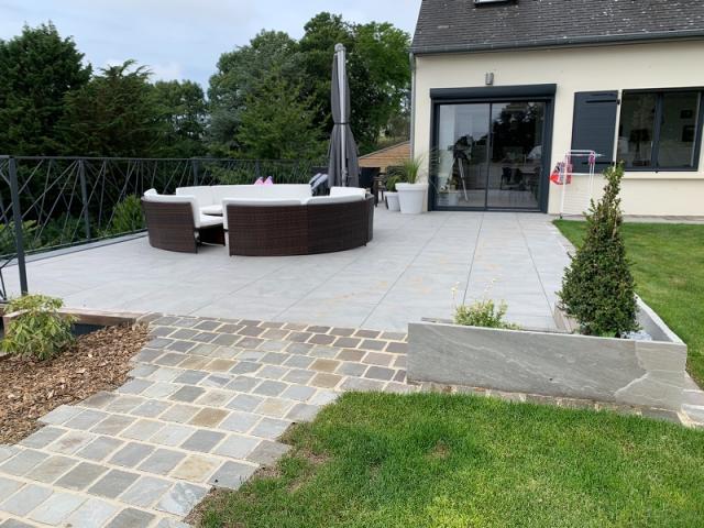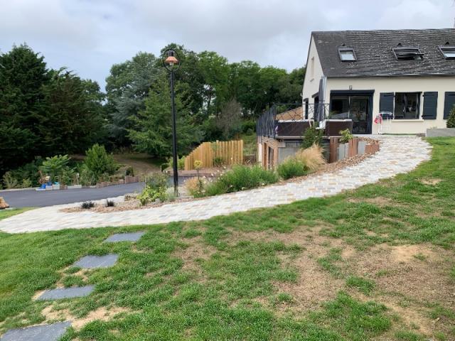 Du végétale avec des traverses en bois pour retenue de terre et brise vue avec du minéral pour le pavage et terrasse en dallage sur plot.