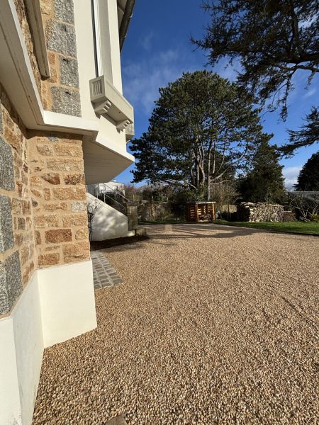 Nos équipes ont installé des alvéoles remplies de gravier beige, offrant une surface stable, drainante et facile à entretenir, tout en préparant le terrain pour les circulations et zones de vie extérieures.