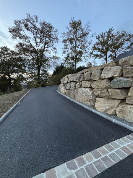 Pour compléter cet aménagement, nous avons réalisé un revêtement en enrobé, garantissant résistance et confort d’usage, ainsi que des chaînettes de pavés double rang en pavés grès multicolore.